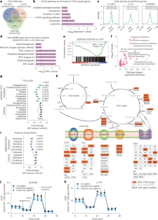 a, IGV snapshot showing TFE3 fusion (orange track) and H3K27ac (light or dark blue tracks) signal at representative OXPHOS-related loci in ccRCC and tRCC cell lines. b, Bar plot showing the top gene sets depleted upon ASPSCR1-TFE3 knockout in FU-UR-1 cells. c, GSEA plot showing depletion of OXPHOS gene signature in FU-UR-1 cells upon ASPSCR1-TFE3 knockout. d, Heatmap showing the change in expression of OPXHOS genes targeted by TFE3 fusion following ASPSCR1-TFE3 knockout in s-TFE cells or FU-UR-1 cells. e, Western blot for TFE3 and SDHA after knockout of WT TFE3 or TFE3 fusion in ccRCC cell line (786-O) or tRCC cell lines (UOK109, FU-UR-1, s-TFE). Change in SDHA protein level was quantified by ImageJ. f, Western blot for TFE3, OXPHOS after knockout of TFE3 or TFE3 fusion in ccRCC cell line (786-O) or tRCC cell lines (UOK109, FU-UR-1, s-TFE). Change of NDUFB8 protein level was quantified by ImageJ. g, IGV snapshot showing TFE3 fusion (orange track) and H3K27ac (light or dark blue tracks) signal at ASS1 locus in ccRCC and tRCC cell lines. h, OCR after knockdown of ASPSCR1-TFE3 in FU-UR-1cell line. Data shown as mean -+ s.d. for n = 8 biological replicates. i, GSEA plot showing no significant change of OXPHOS gene signature in 786-O ccRCC cells upon TFE3 knockdown. j, Change in levels of TCA cycle-related metabolites following TFE3 knockout in 786-O cells. For each metabolite, fold change was normalized to control sgRNA condition. Data are shown as mean (vertical line) and n = 5 biological replicates per cell line. k, Change in levels of arginine biosynthesis-related metabolites following TFE3 knockout in 786-O cells. For each metabolite, fold change was normalized to control sgRNA condition. Data are shown as mean (vertical line) and n = 5 biological replicates per cell line. l, OCR after knockout of TFE3 in 786-O ccRCC cell line. Data are shown as mean -+ s.d. for n = 13 (786-O control sgRNA) and n = 10 (786-O TFE3 sgRNA-1) biological replicates. For (c) and (i), p value was determined by one-sided permutation test. For (j and k), statistical significance was determined by two-sided Mann–Whitney test.