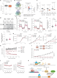 a, HIF1A mRNA level in ccRCC or tRCC tumours from three independent studies (TCGA, Motzer et al., Elias et al. (PDX))20,21,22. b, HIF1A mRNA level in tRCC cell lines (n = 3, UOK109, FU-UR-1, s-TFE) versus ccRCC cell lines (n = 7, A498, A704, 786-O, 769-P, Caki-1, Caki-2, OS-RC-2). c, OCR after knockout of VHL in UOK109 and s-TFE cell lines. Data are shown as mean -+ s.d. for n = 8 (UOK109 control sgRNA), n = 12 (UOK109 VHL sgRNA-1), n = 11 (UOK109 VHL sgRNA-2), n = 13 (s-TFE control sgRNA, s-TFE VHL sgRNA-1) and n = 10 (s-TFE VHL sgRNA-2) biological replicates. d, Genes whose knockout has been previously reported27 to confer sensitivity (422 genes) or resistance (79 genes) to NRF2 activation were compared for dependency in s-TFE cells vs. ccRCC cells (average of dependency score for 5 ccRCC cell lines, for each gene). e, Western blot showing the expression of EGLN1, VHL, HIF-1-α after knockout of VHL in ccRCC (786-O) and tRCC (UOK109, s-TFE and FU-UR-1) cell lines. f, Cell proliferation of tRCC cell lines (UOK109 and s-TFE) and ccRCC (786-O) cell lines after knockout of VHL. Data are shown as mean -+ s.d. for n = 3 (UOK109, 786-O) and n = 5 (s-TFE) biological replicates. g, Western blot showing the expression of EGLN1, VHL after knockout of EGLN1 or VHL in tRCC (FU-UR-1) cell line. h, Cell proliferation of FU-UR-1 cells after knockout of EGLN1 or VHL. Data are shown as mean -+ s.d. for n = 3 biological replicates. i, Western blot showing the expression of EGLN1, VHL after knockout of EGLN1 or VHL in ccRCC (Caki-1) cell line. j, Cell proliferation of Caki-1 cells (VHL preserved) after knockout of EGLN1 or VHL. Data are shown as mean -+ s.d. for n = 6 biological replicates. k, Western blot showing the HIF-1-α expression in UOK109 and s-TFE expressing sgRNA target HIF1A after treatment with EGLN inhibitor (FG4592). Western blot performed once. For (a) and (d), statistical significance was determined by two-sided Mann–Whitney test. Centre line, median; box limits, upper and lower quartiles; whiskers, 1.5 times the interquartile range. For (f), (h) and (j), statistical significance was determined by two-tailed Student’s t-test.