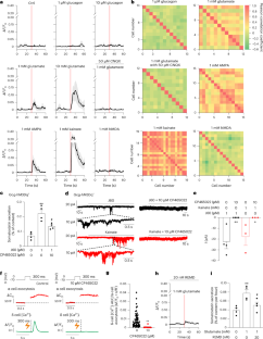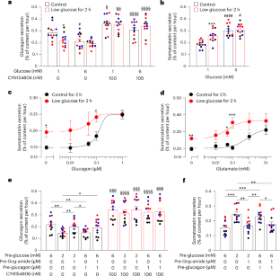 a-b, Glucagon (a) and SST (b) secretion at 1 mM glucose in Gcg-hM3Dq+ islets pre-treated with conditions as indicated (7 experiments/group from 6 mice). **p = 0.0011, ***p = 0.0009 vs. control, #p = 0.02, ##p = 0.004 vs. with J60 alone. c-d, As in (a-b) but show glucagon (c) and SST (d) secretion measured in Gcg-hM3Dq− islets (7-8 experiments/group from 6 mice). e-f, Glucagon (e) and SST (f) secretion at 1 mM glucose in wildtype (C57BL/6) islets pre-treated with conditions as indicated (5 experiments/group, 8 mice). *p < 0.05 vs. control. #p = 0.015, ###p = 0.0004 vs. 2 mM glucose alone. g-h, SST (g) and glucagon (h) secretion at 1 mM glucose in islets that were pre-treated with different concentration of added exogenous glucagon (0, 0.01 µM, 0.1 µM and 1 µM) 18 h previously (5 experiments/group, 8 mice). **p < 0.01, ***p = 0.0002 vs. control (no added exogenous glucagon). i, Representative α-cell [Ca2+]i oscillations (ΔF/F0) in Gcg-GCaMP6 islets at 1 mM glucose in response to 100 nM CYN154806 pre-treated with conditions as indicated on the left to the traces. j, Percentage of active α-cell at 1 mM glucose of experiments shown in (i) (control, n = 4 islets; 2 mM glucose pretreatment, n = 6 islets; 2 mM glucose with Gcg-amide, n = 5 islets; 4 mice). *p = 0.04 vs. control. #p = 0.04 vs. 2 mM glucose alone. k, Summary of α-cell Ca2+ spike frequency of experiments shown in (i). Control ± CYN154806, n = 58 cells from 4 islets; 2 mM glucose pretreatment ± CYN154806, n = 104 cells from 6 islets; 2 mM glucose with Gcg-amide ± CYN154806, n = 85 cells from 5 islets; 4 mice. For comparison, the responses in islets that were continuously cultured at 6 mM glucose are shown as controls (data from Fig. 1d). ***p = 0.0002 vs. control; #p = 0.04 vs. 2 mM glucose alone (two-sided unmatched rank sum Mann-Whitney test). §p = 0.02, §§§p < 0.001 vs. without CYN154806 in the same treatment group (two-sided paired Wilcoxon test). l, Representative δ-cell [Ca2+]i oscillations (ΔF/F0) in Sst-GCaMP6 islets at 1 mM glucose pre-treated with conditions as indicated. m-n, Percentage of active δ-cell at 1 mM glucose (m) and summary of δ-cell Ca2+ spike frequency (n) of experiments shown in (l). In (m): control, n = 4 islets; 2 mM glucose pretreatment, n = 6 islets; 2 mM glucose with Gcg-amide, n = 5 islets; 4 mice. ***p = 0.0008 vs. control; ##p = 0.003 vs. 2 mM glucose alone; two-sided unpaired t-test. In (n): control, n = 46 cells from 4 islets; 2 mM glucose pretreatment, n = 65 cells from 6 islets; 2 mM glucose with Gcg-amide, n = 42 cells from 5 islets; 4 mice. *p = 0.048 vs. control; #p = 0.022 vs. 2 mM glucose alone; two-sided Mann-Whitney test. o-p, Glucagon (o) and SST (p) secretion at 1 mM glucose in wildtype islets pre-treated with conditions as indicated (4 experiments/group from 4 mice). *p < 0.05 for indicated comparisons. Exogenous glucagon, J60, Gcg-amide, glutamate or CNQX was applied during the preincubation with indicated glucose concentration. For clarity, pre-treatment conditions are noted with the prefix ‘Pre-‘. CYN154806 and adrenaline were applied acutely during perfusion (Ca2+ imaging). Hormone secretion experiments were conducted ~18 h post preincubation. Islets were kept in 6 mM glucose except for the duration of pret-reatments. Symbols and error bars and rectangles and error bars behind data points represent mean values ± S.E.M. Violin plots show the median with quartiles. Two-sided unpaired t-test was used in (a-h, j, m, o-p).