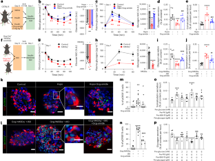 a, Plasma glucose levels after administration of saline (‘control’, black), insulin (‘hypo’, red) or the combination of insulin and Gcg-amide (1 mg/kg; ‘hypo + Gcg-amide’, blue) on Day 0 (5 mice/group). **p = 0.009, ***p = 0.0005, ****p < 0.0001 vs. control; #p = 0.04, ##p = 0.005 vs hypo alone. b-c, Plasma glucose (b) and glucagon (c) levels relative to baseline (0 min) during ITTs on Day 1 in control (black), hypo (red), and hypo + Gcg-amide (blue) groups (5 mice/group). Right panels summarise the AUCs of each group. *p < 0.05, **p < 0.01, ***p < 0.001 vs. control. #p < 0.05, ##p < 0.01 vs. hypo alone. d, Schematic of the protocol for in vitro islet function assessment following in vivo conditioning. Wildtype mice were administered with saline (‘control’), insulin (‘hypo’) or the combination of insulin and Gcg-amide (1 mg/kg; ‘hypo+Gcg-amide’) on Day 0. On Day 1, 24 h later, islets were isolated and hormone secretion was tested. e, Plasma glucose levels on Day 0 during in vivo conditioning period in mice that underwent indicated treatments (2 mice/group). f, Glucagon secretion measured at 1 mM glucose in the presence of 100 nM CYN154806 in islets isolated from mice that were subjected to in vivo treatments as indicated 24 h ago (control, n = 10 experiments; hypoglycaemia alone, n = 8 experiments; hypoglycaemia with Gcg-amide, n = 11 experiments; 2 mice/condition). g-i, Plasma glucagon (g), glucose (h), and insulin (i) levels after administration of J60 (0.1 mg/kg, 0 min; arrow) on Day 0 in Gcg-hM3Dq− (black, n = 12 mice) and Gcg-hM3Dq+ (red, n = 9 mice) mice. *p < 0.05, **p < 0.01, ****p = 9.6×10−5 vs. Gcg-hM3Dq−. j, As in (d), but illustrating the protocol used with mice subjected to chemically-induced hyperglucagonemia conditioning. Gcg-hM3Dq− and Gcg-hM3Dq+ mice were administered with J60 or the combination of J60 and Gcg-amide (1 mg/kg; ‘Gcg-amide’) on Day 0. On Day 1, 24 h later, islets were isolated and hormone secretion was tested. k, Plasma glucose levels on Day 0 in in vivo conditioning period in Gcg-hM3Dq− and Gcg-hM3Dq+ mice that underwent indicated treatments (2 mice/group). l, Glucagon secretion measured at 1 mM glucose in the presence of 100 nM CYN154806 in islets isolated from Gcg-hM3Dq− and Gcg-hM3Dq+ mice 24 h after previous in vivo treatments as indicated (Gcg-hM3Dq−, n = 10 experiments; Gcg-hM3Dq+ with J60, n = 9 experiments; Gcg-hM3Dq+ with J60 and Gcg-amide, n = 7 experiments, 2 mice/condition). Symbols and error bars and rectangles and error bars behind data points represent mean values ± S.E.M. Two-sided unpaired t-test was used in (a-c, f-i, l). (d, j) were created with BioRender.com.