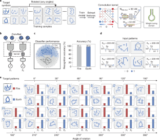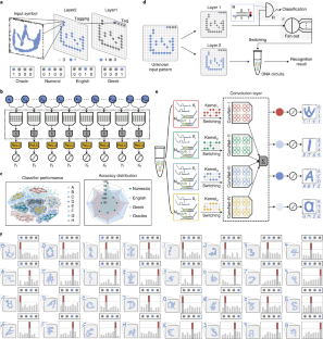 a, The shared convolution kernel reacts with each receptive region to implement the weight multiplication. The value of each pixel in each receptive region was used to determine concentrations of each weight substrate molecules. For example, 23 nM for the 24th pixel and 32 nM for the 9th pixel. Different weight substrate molecules have distinct weight tuning domains (for example, NW24,I42,2 and NW9,I21,3). Because of the shared convolution kernel, the sequence of weight tuning domains (green region) of weight species is the same for each pixel that interacts with the same kernel function in different receptive regions (for example, NW24,I42,2 and NW24,I115,6). b, The recognition process of oracle ‘fire’ with the DNA-based ConvNet. c, The pooling layer reduces feature map size by taking the maximum value from a few contiguous pixels. The symbol ∑ indicates the sum over all inputs. Here, we used pooling computing to help identify which memory the pattern is the most similar—using the overall statistical characteristics of the adjacent output of a location to replace the output of the network at that location (pooling size 2×1, stride = 1). To realize the pooling computation, the two contiguous pixels—represented by concentrations of two distinct nucleic acids sequences—need to be compared to determine which is the largest. Note that the ‘annihilator’ gate in pooling layer was built based on the cooperative hybridization mechanism introduced by Cherry and Qian8. Coloured lines in DNA strands indicate distinct functional domains.