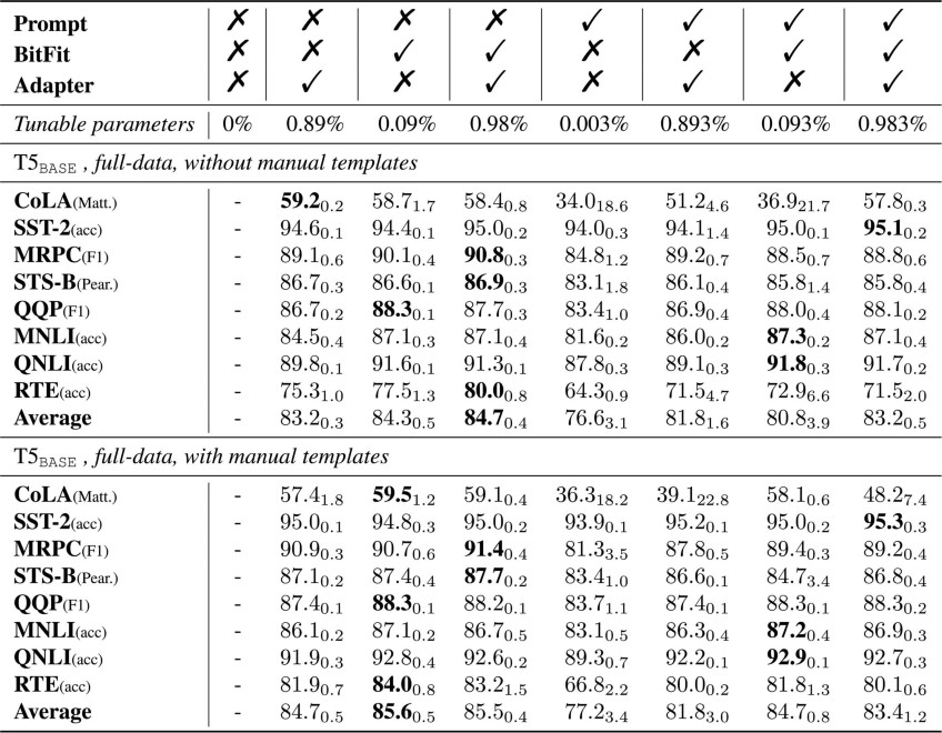 1. Performance of T5BASE on GLUE datasets. We report the average result of multiple random seeds on the validation set. denotes the component is included in the combination and ✗ denotes it is excluded in the combination.