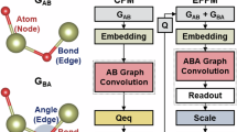 Different from previous GNN models such as M3GNet18, where three-body spherical harmonics features are used to update bond features, we explicitly encode and update atoms, bonds and angles embeddings through the interaction blocks that operate upon the pairwise connections pre-defined in atom graph and bond graph. For the atom graph convolution, a weighted message passing layer is applied to the concatenated feature vectors \((\mathbf{v}_{i}^{t}| | \mathbf{v}_{j}^{t}| | \mathbf{e}_{ij}^{t})\) from two atoms and one bond. For the bond graph convolution, the weighted message passing layer is applied to the concatenated feature vectors \((\mathbf{e}_{ij}^{t}| | \mathbf{e}_{jk}^{t}| | \mathbf{a}_{ijk}^{t}| | \mathbf{v}_{j}^{t+1})\) from two bidirected bonds, the angle between them and the atom where the angle is located. For the angle update function, we used the same construction for the bond graph message vector but without the weighted aggregation step. The mathematical form of the atom, bond and angle updates are formulated below: