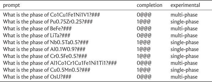 Extended Data Table 1 Example prompts and completions for predicting the phase of high-entropy alloys