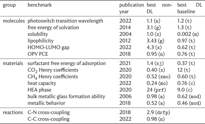- For the best comparison, we also split into (pre-trained) deep-learning (DL)-based baselines (here, MolCLR68, ModNet69, CrabNet62, and TabPFN70) and baselines not using (pre-trained) deep-learning approaches (n-Gram, Gaussian Process Regression, XGBoost, random forests, automated machine learning optimized for materials science25) on hand-tuned feature sets. For the analysis in this table, we fit the learning curves for the GPT-3 models and for the baselines and measure where the learning curves intersect, that is, we determine the factor of how much more (or less) data we would need to make the best baseline perform equal to the GPT-3 models in the low-data regime of the learning curves. Full learning curves for all models can be found in Supplementary Note 6. In parentheses, we mention the baseline we considered for each case study. In doing so, we use the following acronyms: t for TabPFN70, m for MolCLR68, n for n-Gram, g for GPR71, x for XGBoost72 on molecular descriptors such as fragprints71, xmo for XGBoost model similar to the one in Moosavi et al.73, xj for an XGBoost model similar to the one in Jablonka et al.45, mo for the atom-centered model from Moosavi et al.74, c for CrabNet62, prf for the random forest model reported by Pei et al.24, a for automatminer25, mod for ModNet69, drfp for differentiable reaction fingerprints75 as input for a GPR71. For the case studies on reaction datasets, we did not consider a deep learning baseline. There are several caveats to this analysis. First, focusing on the low-data regime might not always be the most relevant perspective. Second, we only focus on the binary classification setting in this table. Third, we focus on the F1 macro score for this table (all cases are class-balanced). Fourth, we consider the performance of the GPT-3 model for ten training data points as a reference. We provide more details in Supplementary Note 6. The version of GPT-3 we utilized in this work has been trained on data up to Oct 2019 that mostly comes from web scraping (Common Crawl76 and WebText77) along with books corpora and Wikipedia. Structured datasets, however, have not been part of the training. Also, note that our approach works well on representations that have not been used for the original datasets (for example, SELFIES, InChI). For the case studies on reaction datasets, we did not consider a deep learning baseline, hence the corresponding values have been omitted in the table. For computing the table, we utilized data reported in Refs. 78,79,80,81,82,83,84,85,86,87,88.