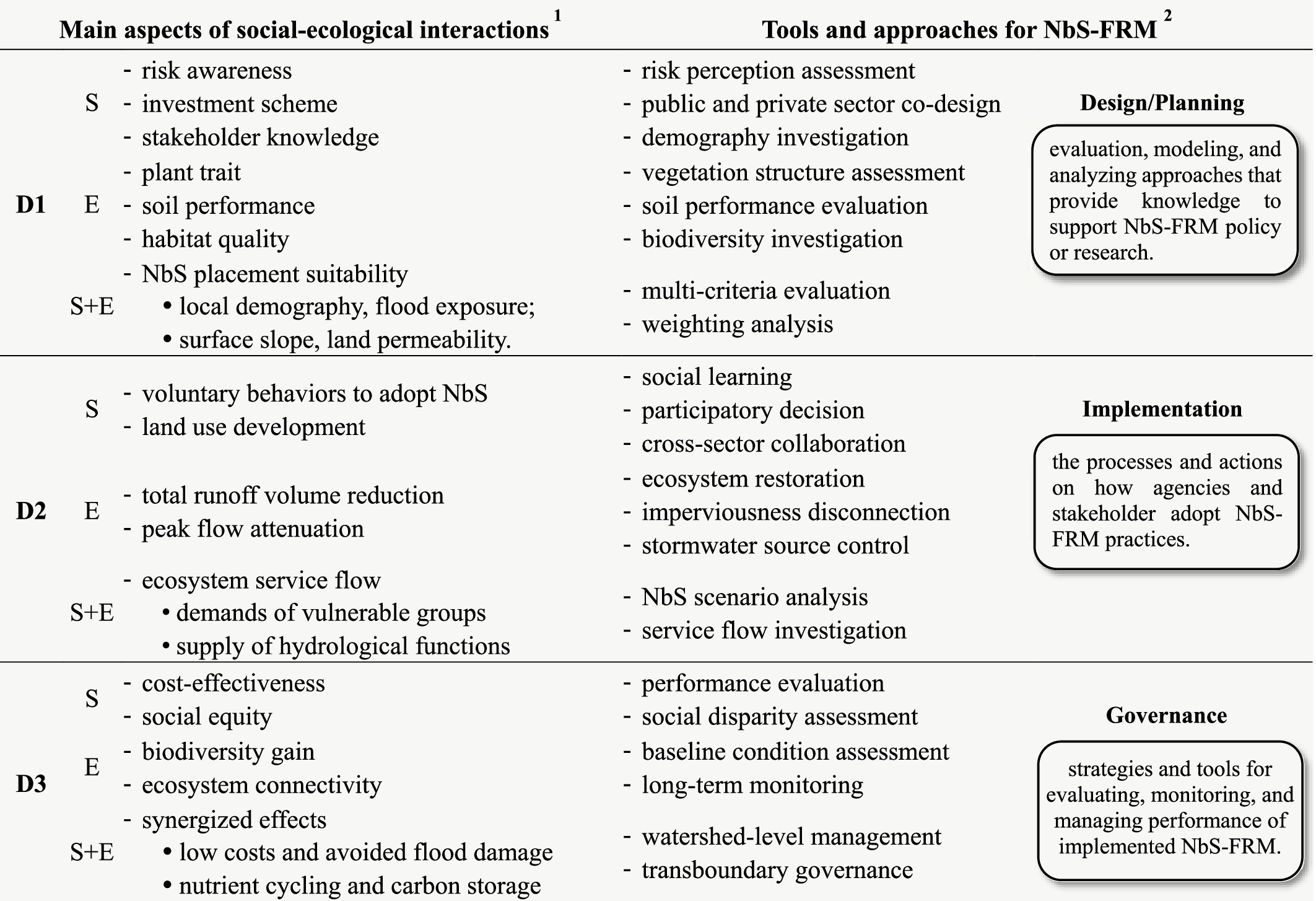 Table 1 Main aspects of the social-ecological interactions considered in the reviewed studies, and relevant approaches and tools provided to support NbS-FRM