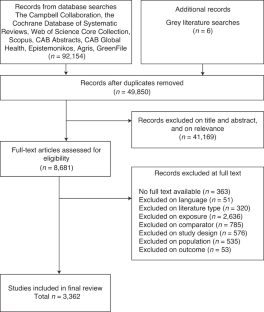 This review was conducted in partnership with the Campbell Collaboration, for which we acknowledge the wider support of A. Saran, V. Welch, A. Bhavsar and A. O’Connor, as well as the EPPI Reviewer team at the University College London, which includes J. Brunton, Z. Grouze and S. Graziosi. We thank J. Eyers for his specialist input in crafting our search strategy. Substantial contributions were also made by London School of Hygiene & Tropical Medicine and Campbell-affiliated data screeners and coders, which include L. Hishi, A. Noubani, N. Ashley dela Cruz, P. Hawkins and A. Clarke. We express thanks to E. Joy, T. Sparling and T. Galloway for ad hoc guidance concerning the process and/or content of the review. We thank O. Kolade for her programme management support via IMMANA. This study was funded through UK Aid from the UK Government and the Bill & Melinda Gates Foundation via the Innovative Methods and Metrics for Agriculture and Nutrition Actions (IMMANA) programme, based at the London School of Hygiene & Tropical Medicine.