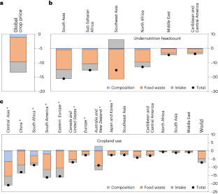 Bars represent percentage changes in 2050 baseline outcomes caused by shifting towards diets following flexitarian diets pathway (FLX) in the regions in italic and marked with asterisk starting with Central Asia and ending with Japan and Korea. Regions exogenously shifted to the FLX are in italic and marked with an asterisk, food demand patterns in the remaining regions are endogenous. Panel a represents the percentage change in global crop price, panel b represents reductions in undernutrition headcounts in those regions where diets are endogenously determined as a function of prices, and panel c represents changes in cropland use. Coloured segments of each bar decompose the total change into three different components of the shift from current food demand levels: the change within the food basket composition (that is, the FLX scenario implies reductions in livestock demand with respect to the baseline case), reductions in food intake, and reductions in food waste3.