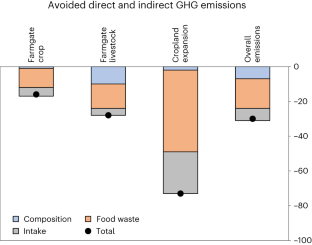 The GHG emissions associated with crop and livestock production include the direct “farmgate” emissions. Indirect emissions include emissions due to the conversion of natural lands into crop production (See Supplementary Information for details). Bars represent percentage changes with respect to the 2050 baseline case, caused by shifting towards diets following healthy dietary guidelines (HDG). Results represent the breakout between three different components within the shifts in food demand: the change within the food basket composition (that is, the HDG scenario implies reductions in livestock demand with respect to the baseline case), reductions in food intake, and reductions in food waste59. (Fig. 5 presents results on flexitarian diets pathway).