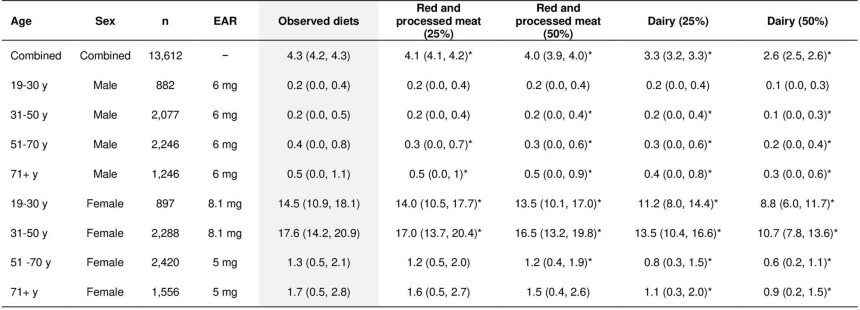 1. Estimates are percentage below the EAR (95% CI) based on usual intakes from foods. Certain estimates may appear equal due to rounding. * = p < 0.05 vs. observed diets by one-sided paired z-test. The p-values are adjusted for multiple comparisons. Males could not be compared to females due to differing recommendations. EAR = Estimated Average Requirement.