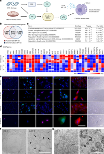(a) Top 24 terms appearing in the enrichment analysis of overlapping differentially expressed genes between PBF-15 and Sn-BF-15, and PBF-13 and Sn-BF-13, respectively (n=3). (b) Senescent fibroblasts exhibit a fragmented nucleus as seen in transmission electron microscopy (TEM) images (arrowheads). Scale bar 10 µm. (c) TEM images showing cytoplasmic organelles and structures in primary and senescent fibroblasts. Mitochondria (M), rough- and smooth- ER (RER and SER) respectively, membrane whorls (MW), autophagosome (AP). Scale bar 2 µm.
