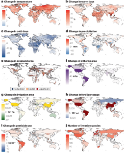 Agricultural practices, such as irrigation and fertilization, provide pests with optimal host plant conditions, buffer climate stresses and reduce natural biological control through reduced biodiversity, whereas Bt-crop adoption curtails pest population. Land use changes, such as deforestation and cropland expansion, proliferate pests by modifying local climates, creating favourable conditions for pests and disrupting natural enemies, whereas landscape diversification promotes natural pest control.