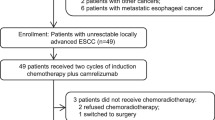 The main inclusion criteria were histologically confirmed primary ESCC, an unresectable tumor with T4b (a tumor invading other adjacent structures such as the aorta, vertebral body or trachea) and/or regional lymph node and/or supraclavicular lymph node invasion of adjacent structures other than the esophagus, treatment with two cycles of CDDP (70 mg m−2) on day 1 plus 5-FU (700 mg m−2) on days 1–4 every 4 weeks and 60 Gy/30 fractions of radiotherapy, and the absence of esophageal perforation, esophagotracheal fistula, esophagomediastinal fistula, bleeding from arterial invasion or respiratory stenosis when CRT was completed (Supplementary Table 6). Clinical stage was assessed by members of a multidisciplinary team according to the Eighth TNM staging system of the American Joint Committee on Cancer58.