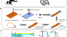 To showcase the practical relevance of the high compliance of our robots, we demonstrate insertion and release of a triangle-shaped swimming robot into a narrow syringe when manipulated by a magnetic field (2 mT, 2 Hz; Fig. 5, Supplementary Movie 14). Primarily, the ultrathin design provides a high degree of freedom to the untethered body deformation of the robots. This feature enables them to pass through channels with an opening smaller than their lateral dimensions. We illustrate this by inserting a rather large (lateral dimensions: 12 × 5.8 mm2; thickness 45 µm) triangle-shaped swimming robot into a pipette tip with an opening of 1.8 mm in diameter. Upon insertion, the robot wraps itself to minimize its cross-section. When needed, the robot can be released from the pipette in ethanol solution and continue swimming. Upon this manipulation, the robot fully recovers its initial dimensions. We also show self-cleaning capabilities using our soft robot driving by the square wave magnetic field (4 mT) at a high frequency of 30 Hz (Supplementary Fig. 22 and Supplementary Movie 15).