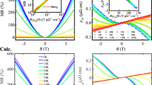 Magnetic field dependence of MRR and ρyx up to 54 T for NRO are presented in Fig. 4a, b, respectively, together with the results measured with a PPMS up to 9 T (thick lines). As presented in Fig. 4a, MRR increases monotonically up to 54 T above 10 K. Below 10 K, MRR decreases at lower fields with a minimum at B ≈ 10 T and turns to increase at higher fields similar to the ones above 10 K. This can be seen more clearly in Fig. 4d, where ρxx − T curves under different magnetic fields are shown. Intriguingly, the slopes of ρyx saturate at a similar negative value at higher fields regardless of the measurement temperatures (Fig. 4b). Because of this, ordinary Hall coefficient (RH) can be deduced from linear fittings of ρyx between 45 T and 54 T. As presented in Fig. 4e, RH has little temperature dependence below 150 K. Therefore, with the help of the high-field measurements, the sign reversal of ρyx observed in Fig. 3f is revealed to be irrelevant to a carrier-type change.