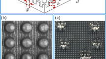 A polystyrene Petri dish was filled with DI water to a height of ~1 cm. The SHS samples were then immersed underwater forcing them to sink to the bottom. The solid–liquid area fraction was obtained using a Nikon Eclipse LV 150 with the E Plan 5×/0.1 objective (WD 20) microscope equipped with a Nikon DS-Fi1 camera in bright-field reflectance mode.