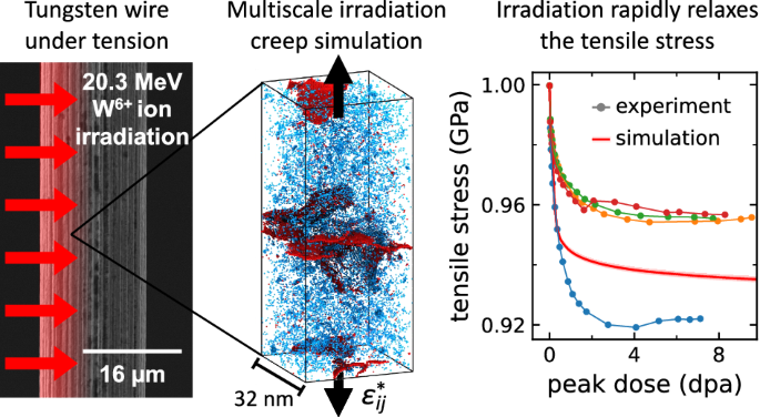 In this study, we develop a comprehensive quantitative treatise of the anomalous low-temperature irradiation creep phenomenon by combining custom-designed experiments with in situ measurement capabilities and a parameter-free multiscale model. Figure 1 illustrates a time-resolved observation of stress relaxation in a 16 μm thin tungsten wire – thinner than a human hair – under exposure to highly energetic ions. Initially, the wire is stretched until a specified tensile load is reached. Subsequently, the wire is exposed to the ion beam while the force required to maintain its length is monitored. Despite the wire remaining at a temperature where no thermally-driven creep occurs, our observations reveal an initial rapid relaxation of the force occurring within minutes, followed by slower relaxation plateauing over a few hours. Significantly, in Fig. 1f we observe the extent of relaxation to be linearly proportional to the external load, which is in remarkable qualitative and quantitative agreement with predictions derived from an in silico replication of the experiment through a parameter-free model. Our analysis shows that the relaxation is non-linear and involves the coarsening of microscopic defects under external stress. Since only 4% of the wire material is exposed to high-energy ions, the extent of the measured relaxation suggests that locally in the irradiated surface layer, the applied tensile loads of up to 2 GPa relax entirely and solely through the anomalous fast low-temperature irradiation creep.