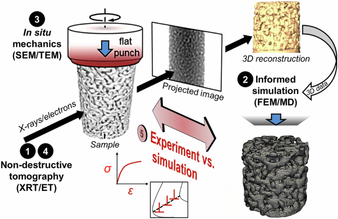 The 3D network structure of FIB prepared npg pillars is obtained by (1) non-destructive tomography and used as input for (2) correlative mechanical simulations. After (3) experimental compression the 3D network is (4) visualized again by means of the tomographic techniques. The resulting experimental and simulated stress-strain response, strain fields and crystal defects are compared and evaluated. For small ligament length (L ~30 nm) 360° electron tomography (ET) is combined with in situ TEM compression testing and molecular dynamics (MD) simulations, while on larger length scale (L ~300 nm) nano X-ray computed tomography (nano-CT) is combined with finite element (FE) crystal plasticity simulations and in situ scanning electron microscopy (SEM) compression testing.