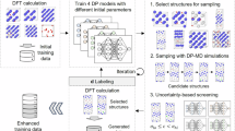 In this subsection, the construction procedure of the Ni–Mn–H MLIP is outlined. In the subsequent subsections of the Results and discussion section, we demonstrate the accuracy of the developed MLIPs in reproducing the properties of Ni–Mn alloys relevant to hydrogen diffusion and the hydrogen behavior therein, through comparison with DFT calculations. Additionally, we report hydrogen-diffusion coefficients within Ni–Mn alloys determined from MD simulations conducted using the devised MLIPs and compare those coefficients with the experimental values. Based on these computational results, we then revealed, at the atomic scale, the effect of Mn on the hydrogen diffusivity at the atomic scale. Finally, we discuss the potential for further development of the methods and the insights obtained in this study. The method used to calculate the hydrogen-diffusion coefficients via MD simulations, which identifies the atomic environments that should be sampled to construct the MLIP training dataset, is described in the Methods section. The training-dataset generation and the MLIP training process are also described in the Methods section, and details of the DFT settings used for the training-data generation and validation are provided. In this study, we constructed an MLIP for the Ni–Mn–H system that can accurately predict the hydrogen diffusion coefficients; this was achieved using the recently developed GeNNIP4MD software package75, which is an MLIP construction tool. Active learning methods based on the atomic-force uncertainty, which are provided in the DP-GEN software platform74, are widely used for MLIP construction. In GeNNIP4MD, a more sophisticated active learning approach is adopted75, which combines uncertainty-based active learning74 with an additional screening process based on the structural features. GeNNIP4MD likely enables efficient generation of the most compact and appropriate training dataset for a high-accuracy MLIP75. In this study, we employed the DP framework76, which is commonly used in DP-GEN. The current implementation of GeNNIP4MD supports DP framework, including M3GNet77 and CHGNet78. In principle, however, it can also be extended to other potential forms such as the Behler–Parrinello neural network potential (BNNP)79, atomic cluster expansion (ACE)80, moment tensor potential (MTP)81, Gaussian approximation potential (GAP)82, and spectral neighbor analysis potential (SNAP)83. The MLIP construction method using GeNNIP4MD is illustrated in Fig. 1. Following preparation of an initial training dataset, model training and training-data generation processes were iteratively executed until the model achieved sufficient prediction accuracy. The training-data generation process comprised three steps: (1) generation (sampling) of candidate structures, (2) screening of candidate structures via active learning, and (3) DFT labeling of the screened structures to create a labeled training dataset. First, multiple DP models with different initial parameters were trained using the initial training data (Fig. 1b). In the subsequent step, in which the candidate structures were generated (Fig. 1d), one of those DP models (e.g., one of four) was used to perform multiple MD simulations on the target atomic system. For example, long-term annealing under various temperature and pressure conditions was simulated. Hence, a large and diverse set of candidate atomic structures was generated. In the next step, two screening methods were applied to select training-data candidates. First, uncertainty-based screening was performed, through which deviations in the atomic forces predicted by the multiple DP models were evaluated. Structures with deviations within predefined lower and upper thresholds were selected. These thresholds were set to enable appropriate identification of structures for which the model was undertrained and the prediction errors were high. In DP-GEN, the structures selected through this uncertainty-based screening were used directly for labeling. By contrast, the GeNNIP4MD tool further applied structural feature-based screening to the structures already selected by the uncertainty-based method. In detail, the similarities between the uncertainty-selected structures and existing training data were evaluated, and structures with low similarity were preferentially chosen. This dual screening process was expected to yield high-accuracy MLIP construction with fewer iteration cycles and a smaller training dataset using GeNNIP4MD compared to that achieved with DP-GEN75,84. In the subsequent step, i.e., labeling, DFT calculations were performed on the structures selected by both screening methods to generate labeled training data. The DPs were then retrained using both the newly obtained and existing training datasets. The predictive accuracies of the retrained DPs were evaluated, and if necessary, the data generation and model retraining processes were repeated. Following sufficient iterations, the final DP was obtained through training with both the initial and newly added training datasets.