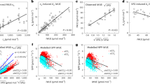where ci and ca are the CO2 intercellular and ambient air concentrations, respectively. As can be seen from Eq. 1, an increase in the atmospheric CO2 concentration, ca, will cause a proportional increase in A/gs of leaves, so long as ci/ca remains approximately constant. This means that all else being equal and with stable ci/ca, iWUE of terrestrial vegetation is expected to increase in direct proportion to increasing atmospheric CO2. Evidence from δ13C in tree rings suggests that this situation has been approximately realized26,29,30. However, environmental factors distinct from ca, such as temperature and precipitation31, plant functional type32,33, tree size/age34, nitrogen (N) deposition35,36, acidic deposition37,38, have independent effects on net photosynthesis (A) and stomatal conductance (gs) and, therefore, may modulate the response of iWUE to rising ca39.