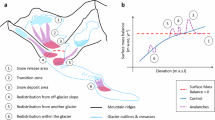 For a rock-ice avalanche, snowfall anomalies will exacerbate the avalanche mobility and lead to an air blast problem. Anomalous snowfall and the associated thick snow cover favor snow entrainment in the mountain environment. This process can magnify the avalanche volume and change the flow behavior. Compared with ice and rock mass, snow is easily entrained because of the low shear stress threshold29. Snow is a material of low friction and can decrease the equivalent Coulomb frictional coefficient (in Eq. (13)) of the avalanche core. One primary consequence of the snow entrainment is the increment of flow height, which increases the normal and shear stress acting on the ground surface. Combined with the entrainment process12, the additional shearing work attributable to the shear stress increment exacerbates the heat energy production within the avalanche core, therefore favoring meltwater production. The lubrication effect of the meltwater greatly enhances the avalanche mobility. Furthermore, the flowing resistance is a function of fluctuation energy \({R}_{\Phi }\) (Eq. (13)), again related to the shearing work and the flow height. Chute experiments30 indicate that friction decreases in proportion to the increase in the gravitational work rate or the shearing work rate. Without considering the entrainment process, there is no mass source for avalanches in motion. For a finite-sized avalanche, shear gradients within the avalanche core cause the flow height to decrease. The shearing work rate and production of fluctuation energy subsequently decline, and friction increases. The avalanche begins to starve and decelerate, eventually stopping on the slope.