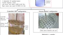 Settling experiments were undertaken in a rectangular settling column water tank 1 m in height (\(z\)), 0.3 m in width (\(x\)), and 0.3 m in length (\(y\)) (Fig. 8D). The settling tank was filled with tap water (salinity 0.01 PSU) to a depth of 0.9 m and kept at room temperature (18–22 °C) during the settling tests. Two small LED spotlights (lighting panel 23 × 20 cm2) were used to illuminate the tank and were positioned away from the settling tank and did not have any influence on heating the setting tank.