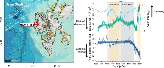 The transition between the Little Ice Age (LIA) and modern warming represents the fastest and most abrupt climate anomaly of the late Holocene11. Despite the relatively coherent pattern of this transition in global temperature reconstructions over the last two millennia12, the timing, climate triggers, and environmental responses differ among regions. In the northernmost Atlantic Ocean, marine sedimentary proxies and ice core data indicate a generalized, although highly variable, increase in sea ice extent during the LIA13. The eastern Fram Strait was characterized by ice advance, whereas the East Greenland Shelf experienced stable marginal ice zone (probably polynya-like) conditions13,14,15. Cold air and ocean temperature also favored glacier growth in high-latitude lands, including Svalbard, Iceland, and Greenland16,17,18. At the beginning of the 20th century, a sharp decrease in sea ice cover in the Nordic Seas corresponded to the termination of the LIA19,20, and glaciers started to retreat from fjords and lowland areas17. As glaciers retreat, new land surfaces are potentially exposed to rapid modification, high erosion rates, soil evolution, and plant community succession, determining in the northern hemisphere a generally more active carbon cycle and faster mobilization pathways between different reservoirs21,22.