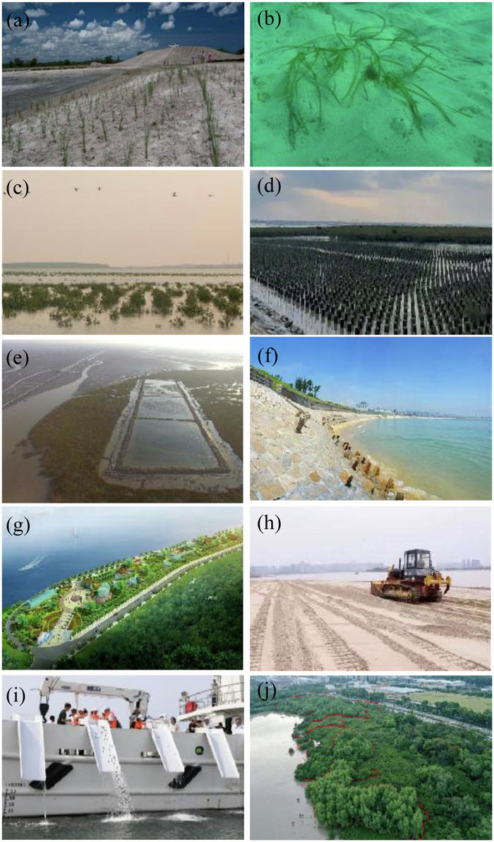 Inappropriate restoration designs and associate techniques were adopted during the implementation | • Simplifying vegetation re-establishment without consideration of the “window of opportunity” theory and habitat improvement in salt marshes (a). • Performing seagrass seeding and seedling transplantation under stresses of strong hydrodynamic disturbance and consumer control (b). • Transforming the structure and even the type of original ecosystems, such as afforestation in mudflats or salt marshes (c). • Establishing coral reefs, seagrass beds, and mangroves in places where they were historically absent (d). • Creating temporary dikes to reduce tidal disturbance to improve the survival of transplanting that fail to resist the stressful environment in the long term. • Eradicating invasive plants, such as Spartina alterniflora simply by plowing, mowing, and/or water flooding, while largely overlooking the damage to native (e). | |