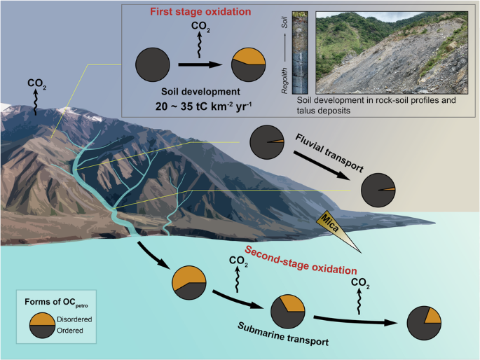 Our study demonstrated prominent shifts in Raman maturity between rocks and weathered materials, and between marine sediments distributed along the submarine canyon. The data pattern suggests two stages of OCpetro oxidation from the rock source to the distal marine depocenter. The first stage involves the in situ transformation of highly mature OCpetro formed by metamorphism to more disordered graphitic carbon in soil-bedrock profiles or talus deposits. The OCpetro with a spectrum of maturity is eroded by mass wasting and transported downstream along with the elimination of mica through abrasion and pulverization prior to being deposited in marine environments. Microbial degradation in river channels appears to impose limited effects on the shift in OCpetro maturity. As sediment transport is primarily facilitated by storm- or typhoon-triggered events, the OCpetro with a variety of maturities is not detected in riverine sediments but occasionally present either in estuarine or nearshore sediments. The second stage of OCpetro oxidation occurs by degrading more disordered graphitic carbon along the submarine canyon, thereby enhancing the preservation frequency of high-maturity OCpetro as the transport distance from the shoreline increases. Based on isotopic compositions, the OCpetro oxidation in the Beinan catchment contributes to a CO2 flux of 20–35 tC km−2 yr−1 from slate and schist. The fluxes alone are comparable to those reported for other mountainous catchments, and offset and even exceed the drawdown contributed by silicate weathering and burial of biospheric OC, highlighting the unique role of mountainous catchments in tectonically active, high-standing islands as a hotspot of CO2 contributor to the global carbon cycle.