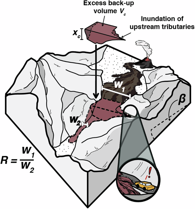 This relationship between R, viscosity, and slope has implications for eruptions of lava, where timescale and reservoir volume affect cooling rate and, consequently, flow behaviour. In an eruption scenario where lava flows down a valley and meets a topographic constriction (Fig. 8), the area downstream of the constriction will eventually experience the same eruptive flux as observed at the vent. However, there will be a time-lag dictated by slope, viscosity, and R value, with the backup reservoir acting as a ‘buffer’ between the vent flux and the downstream flux. If the valley has low slope angles (e.g. 1–10°), the time-lag will be protracted and backup will be more voluminous and will be felt further upstream, where it may inundate valley slopes and tributary valleys that would otherwise remain unimpacted by lava flows (Fig. 8). The phenomenon of upstream lava flow advancement into tributary valleys has been documented upstream of constrictions in channel-confined lavas in the Grand Canyon, USA, Coulstone Lakes Volcanic Field in Australia, and in the Garibaldi Volcanic Belt, in Canada50,53,64. These locations constitute natural examples of lava backup and additional inundation upstream. A further consequence is that the backup behind the constriction can result in an insulated reservoir of lava, retarding cooling, prolonging the time period in which lava flows are active and potentially increasing the distance that lava reaches downslope45,48.