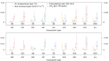 The approach to C3/C4 distribution by Luo2024 is based on a model predicting influences of atmospheric CO2, water stress (soil moisture and vapor pressure deficit), and nitrogen availability on both C3 and C4 photosynthesis45. Our model is simpler; it assumes that the impacts of elevated CO2 and water stress are important only for C3 photosynthesis (Supplementary Figs. 11 and 12) and neglects nitrogen availability effects. Nonetheless, our attribution analysis suggests patterns of variability of F4 with elevated CO2 and water stress (Fig. 5) similar to those in Luo2024. Global F4 and GPP values predicted with our F4 model over the recent years are in line with those using the Luo2024 map over their common period (2001–2016). Finally, when comparing measured and predicted δ13Csoil, our simple model provides better predictions of δ13Csoil than Luo2024 (R2 = 0.58 versus 0.37), giving us confidence in our predictions.