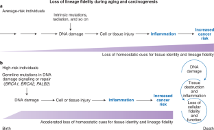 The ability to remain true to cellular identity and function is lost during aging and carcinogenesis when DNA damage triggers inflammation that progressively erodes homeostatic cues. Shalabi et al. show that these losses are accelerated in patients with germline cancer mutations in DNA repair genes and are independent of chronological age.
