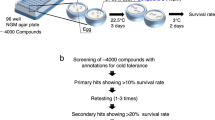 Synchronized larvae were raised and fed OP50 E. coli at 20 °C until day 1 of adulthood. Then, worms were transferred to fresh plates and exposed to 4 °C for 12 h. Worms were returned to 20 °C and checked every day for viability.