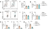 (a-g) C. albicans infection model. (a, b) Colon lengths of Cxxc1f/f and Cxxc1f/f RorcCre mice (n = 4). (c) Fungal burden in faeces (n = 5). (d) Body weight changes (n = 5 WT, n = 8 KO). (e) H&E histological analysis of representative colons in infected mice. (f, g) Representative flow plots and quantification of IL-17A production by CCR6+ ILC3s (left), NKp46+ ILC3s (middle), and DN ILC3s (right) isolated from the siLP (n = 7 WT, n = 9 KO). (h-i) Cytokine production in siLP ILC3s from Cxxc1f/f and Cxxc1f/f RorcCre mice. (h) Flow cytometric analysis of IFN-γ expression in NKp46+ ILC3s after stimulation with PMA and ionomycin (left); right, quantification (n = 4 WT, n = 5 KO). (i) S. typhimurium infection model. Representative flow cytometric profiles (left); right, quantification (n = 4). (j-n) Cxxc1f/f or Cxxc1f/f RorcCre ILC3s (Lin−CD127+CD27−KLRG1−) were adoptively transferred into NCG mice with C. albicans infection. Measurements (j) and statistical analysis (k) of the colon lengths from NCG recipients (n = 5 control, n = 7 WT transferred, n = 6 KO transferred). (l) CFUs in the faeces of NCG recipients 9 days after infection (n = 5 control, n = 7 WT transferred, n = 6 KO transferred). (m) Changes in body weight were recorded at the indicated time points (n = 5 control, n = 7 WT transferred, n = 8 KO transferred). (n) Histological analysis of colonic tissues by H&E staining. Bar graphs are presented as mean ± SEM. A two-tailed Student’s t-test was performed for comparisons. The data are representative of two independent experiments (a-g, i-n) and three independent experiments (h).