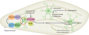 Nicotinamide adenine dinucleotide (NAD+) decline is a molecular characteristic of aging and age-associated neurodegenerative diseases. Lee and colleagues uncover an astrocyte-specific regulatory axis directed by the circadian clock component REV-ERBα, and provide proof-of-concept evidence that targeting this pathway alleviates tauopathy in mouse models.