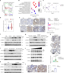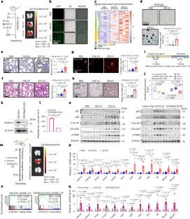 a, Western blot analysis of indicated proteins in MPFs treated with indicated EVs or PBS; β-Actin served as a loading control for the immunoblot. Repeated three times independently with similar results obtained. b, Western blot analysis of t-SMAD3 (total SMAD3) and p-SMAD3 (phosphorylated of SMAD3 at S423/S425) in nucleus and cytoplasmic fractions of WI-38 cells treated with indicated EVs. H3 (a nuclear control) or β-Actin (a cytoplasmic control) served as a loading control. Blots were quantified with ImageJ (quantification of proteins in nucleus or cytoplasmic fractions normalized to respective loading control and shown below image). Experiments were repeated three times independently with consistent results. c, Representative SMAD3 immunofluorescence images and corresponding quantitative analysis in MPFs treated with indicated EVs or PBS. Scale bar, 10 μm; n = 15 cells per group. d, Representative SMAD3 immunofluorescence images and corresponding quantitative analysis in MPFs following 24-hour exposure to 20 μM citrulline or PBS (Scale bar, 10 μm; n = 15 cells per group). e, Western blot analysis of t-SMAD3 (total SMAD3) and p-SMAD3 (phosphorylated of SMAD3 at S423/S425) in nucleus and cytoplasmic fractions of MPFs exposure to 20 μM citrulline or PBS (solvent control). H3 or β-Actin served as a loading control. Blots were quantified with ImageJ (quantification of proteins in nucleus or cytoplasmic fractions normalized to respective loading control and shown below image). Experiments were repeated three times independently with consistent results. f, Stability of the indicated mRNAs in MPFs treated with 20 μM citrulline or PBS (solvent control) incubated with 5 μg/mL of Actinomycin D for the indicated time; n = 3 biologically independent samples per group. g-h, Real-time qPCR analysis of Tgfb1, Tgfb2 and Tgfb3 mRNA abundance in lung tissues from indicated EV tail vein injection group and tumor-bearing group mice (n = 7 mice per group). i, Western blot showing the TGF-β2 and TGF-β3 protein levels of the lungs from indicated group mice; β-Actin served as a loading control. Data were presented as mean ± s.e.m.; exact P values were shown and reported as source data. One-way ANOVA followed by Dunnett multiple comparison test was used for c, g, h; unpaired two-tailed Student’s t-test was used for d; two-way ANOVA was used for f.