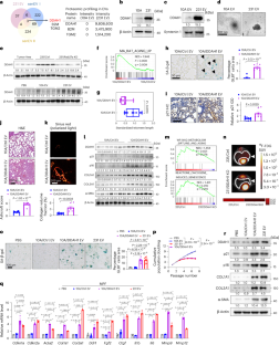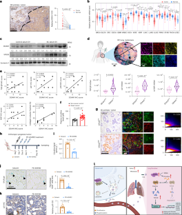 a, Western blot showing the protein level of VPS35 in whole-cell lysates of 4T1/VPS35 KD cells compared with 4T1/Ctrl cells; β-Actin served as a loading control. Repeated three times independently with similar results obtained. b, DDAH1 protein level in 4T1/VPS35 KD EVs; Syntenin-1 served as a loading control. Repeated three times independently with similar results obtained. c, Representative mIHC staining images and quantitative analysis of DDAH1 and CD63 in 4T1/Ctrl or 4T1/VPS35 KD tumors (Scale bar, 20 μm; n = 3 mice per group). d, DDAH1 protein level in circulating EVs extracted from 4T1/Ctrl and 4T1/VPS35 KD tumor-bearing mice serum, ALIX served as a loading control. e, Representative IHC staining images and corresponding quantitative analysis of DDAH1 in 4T1/Ctrl and 4T1/VPS35 KD tumor-bearing mice lung tissues (Scale bar, 100 μm; n = 8 mice per group). Quantification was normalized to the 4T1/Ctrl group. f, Citrulline level in lung tissues from the indicated group of mice (n = 7 mice per group). g, Western blot showing the protein levels of the indicated proteins in lungs from tumor-bearing group mice; β-Actin served as a loading control. h, Representative IHC staining images and corresponding quantitative analysis of TGF-β1 in lung tissues from 4T1/Ctrl and 4T1/VPS35 KD tumor-bearing group mice (Scale bar, 100 μm; n = 8 mice per group). The quantification analysis was normalized to 4T1/Ctrl group. i, Representative senescence-associated β-galactosidase staining images and corresponding quantitative analysis with lung tissues from 4T1/Ctrl and 4T1/VPS35 KD tumor-bearing group mice (Scale bar, 50 μm; n = 8 mice per group). j, Representative p21 IHC staining images and corresponding quantitative analysis of lung tissues from 4T1/Ctrl and 4T1/VPS35 KD tumor-bearing group mice (Scale bar, 100 μm; n = 8 mice per group). Quantification was normalized to 4T1/Ctrl group mice. k, Representative H&E staining images and corresponding quantitative analysis of lung tissues in mice from 4T1/Ctrl and 4T1/VPS35 KD tumor-bearing group (Scale bar, 200 μm; n = 7 mice per group). l, Representative Sirius red staining images and corresponding quantitative analysis of lung tissues from 4T1/Ctrl and 4T1/VPS35 KD tumor-bearing group mice (Scale bar, 200 μm; n = 7 mice per group). m, Real-time qPCR analysis of Cdkn1a, Cdkn2a, Acta2, Col1a1, Col3a1, Ddr1, Fgf2, Ctgf, Il1b, Il6, Mmp9, Mmp12 mRNA abundance in lung tissues from 4T1/Ctrl and 4T1/VPS35 KD tumor-bearing group mice (n = 6 mice per group). Values were normalized to 4T1/Ctrl group mice. n, Proteomic Profiling of proteins in 231 EV. ITGα6 and ITGβ4 were highlighted. o, Proteomic Profiling of ITGα6 and ITGβ4 in IP–MS. p-q, Interaction between Flag-tagged DDAH1 and ITGβ4/α6 was verified by co-IP experiment and immunoblot detection. Intensity of blots was quantified with ImageJ (quantification shown below images). Data were presented as mean ± s.e.m.; exact P values were shown and reported as source data; unpaired two-tailed Student’s t-test was used for c, e, f, h, i, j, k, l, m.