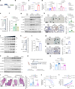 a, Measurement of DDAH1 activity in indicated EVs, with colorimetric detection to determine citrulline level produced by equal amounts of indicated EVs (n = 3 independent replicates). b, Schematic diagram depicted the sites of enzymatically inactive mutant in the DDAH1. c, Western blot showing the levels of indicated proteins in WI-38 cells transfected with wild-type DDAH1 and the enzymatically mutated DDAH1(D127A/H173A/C274A); β-Actin served as a loading control. Repeated three times independently with similar results obtained. d, GFP signals (green) in indicated tissues of AAV6 intranasal administration model mice, including lung, brain, liver, kidney, spleen and heart. Scale bar, 200 μm. e, Representative IHC staining images and the quantification of images of DDAH1 and α-SMA in lung tissues from AAV6 intranasal administration model mice (Scale bar, 200 μm; n = 5 mice per group). Quantification was normalized to AAV-GFP group mice. f, Real-time qPCR analysis of Cdkn1a, Cdkn2a, Acta2, Col1a1, Col3a1, Ddr1, Fgf2, Ctgf, Il1b, Il6, Mmp9, and Mmp12 mRNA abundance in lung tissues from AAV6 intranasal administration group mice (n = 6 mice per group), values were normalized to AAV-GFP group mice. g, Representative Sirius red staining images and corresponding quantitative analysis of lung tissues in mice from AAV intranasal administration model (Scale bar, 200 μm; n = 8 mice per group). h, Representative H&E staining images and corresponding quantitative analysis of lung tissues from AAV intranasal administration group mice (Scale bar, 200 μm; n = 10 mice per group). i, Real-time qPCR analysis of Cdkn1a, Cdkn2a, Acta2, Col1a1, Col3a1, Ddr1, Fgf2, Ctgf, Il1b, Il6, Mmp9, and Mmp12 mRNA abundance in MPFs isolated from indicated group mice (n = 3 biologically independent samples per group). Values were normalized to MPFs isolated from AAV-GFP group mice lungs. j, Population doubling curves of indicated MPFs; n = 3 biologically independent samples per group. k, Representative senescence-associated β-galactosidase staining images and corresponding quantitative analysis of MPFs following 10 days exposure to 20 μM citrulline (Scale bar, 100 μm; n = 10 biologically independent samples per group). l, Population doubling curves of MPFs exposure to 20 μM citrulline or PBS (solvent control); n = 3 biologically independent samples per group. m, Real-time qPCR analysis of Cdkn1a, Cdkn2a, Acta2, Col1a1, Col3a1, Ddr1, Fgf2, Ctgf, Il1b, Il6, Mmp9, and Mmp12 mRNA abundance in lung tissues from citrulline intranasal administration model group mice (n = 8 mice per group). Values were normalized to PBS intranasal administration group mice. n, Representative H&E staining images and corresponding quantitative analysis of lung tissues in mice from PBS/citrulline intranasal administration model (Scale bar, 200 μm; n = 8 mice per group). o, Representative images of Sirius red staining and corresponding quantitative analysis with lung tissues from PBS or citrulline intranasal administration model mice (Scale bar, 200 μm; n = 8 mice per group). p, Representative images and corresponding quantitative analysis of senescence-associated β-galactosidase staining (Scale bar, 50 μm; n = 8 mice per group). The area of SA-β-gal-positive staining was quantified using ImageJ software. Arrows indicated regions that were positive for β-galactosidase staining. q, Representative Sirius red staining images and corresponding quantitative analysis of lung tissues in mice from citrulline intranasal administration tumor-bearing mouse model (Scale bar, 200 μm; n = 8 mice per group). Data were presented as mean ± s.e.m.; exact P values were shown and reported as source data; unpaired two-tailed Student’s t-test was used for a, k, m, n, o, p, q; one-way ANOVA followed by Dunnett multiple comparison test was used for e, f, g, h, i; two-way ANOVA was used for j, l.