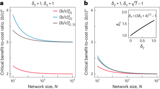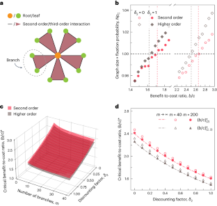 Cooperation is typically facilitated by higher-order interactions in diverse networks with multiple cliques. a, There are 93 networks that have a size of N = 6 and contain at least one triangle. Two examples are illustrated in the upper panel. For every single network, the critical benefit-to-cost ratios for purely pairwise interactions \({(b/c)}_{(2)}^{* }\) and for higher-order interactions \({(b/c)}_{(2,3)}^{* }\) are calculated, and their difference measures how higher-order interactions influence the evolution of cooperation: \({(b/c)}_{(2)}^{* }-{(b/c)}_{(2,3)}^{* } > 0\) indicates that higher-order interactions facilitate cooperation. For δ2 = 1 and δ2 = 0, the red bars show that higher-order interactions facilitate cooperation for only 6 out of the 93 6-node networks. But when we conjoin two such single networks via a random link (averaging over link placement), then higher-order interactions consistently facilitate cooperation (blue bars). b, Three representative classes of random networks: random regular networks (RR), Watts-Strogatz small-world networks with rewiring probability p = 0.3 (SW)53, and Barabási-Albert scale-free networks (SF)54. For each class, we generated 1,000 networks with size N sampled uniformly from [8, 15] and with average degree sampled in [4,N]. The red bars show the effects of higher-order interactions in these single networks (which facilitate cooperation in less than 50% of cases), whereas the blue bars show the effects of higher-order interactions on two-clique networks generated by connecting two identical networks via the node of highest degree: higher-order interactions facilitate cooperation for all such conjoined networks.