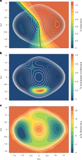 Muller–Brown potential. a, Scatter plot data, reference potential isoline data, reference and learned committor data. b, Sampling distribution data. c, Free energy surface data.