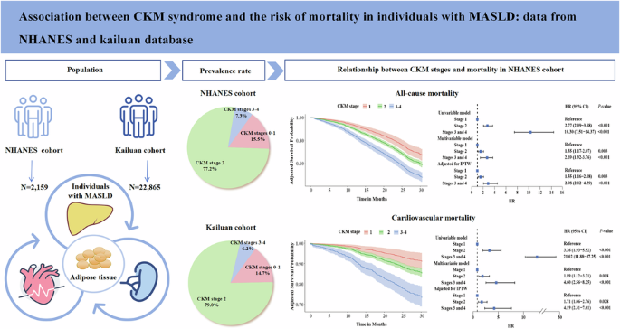 Based on these complex correlations among multiple systems, the American Heart Association (AHA) introduced cardiovascular-kidney-metabolic (CKM) syndrome, which is defined as a systemic disorder characterized by pathophysiological interactions among metabolic risk factors, CKD, and CVD14. In MASLD population, CKM syndrome potentially altered disease progression and clinical outcomes15. However, fewer studies evaluated CKM syndrome stages in MASLD patients. The aim of this study was to determine the prevalence of CKM syndrome and to investigate the associations between CKM and mortality risks among MASLD population.