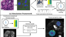 dMRI post-processing consisted of slice-wise Python MP-PCA denoising (kernel: 5 × 5)37; MRTrix3 Gibbs unringing38; motion correction via affine co-registration43; FSL distortion correction44 (1.5 T data only). An experienced radiologists (R.P.L.) segmented tumours on the T2-w scan, enabling per-patient tumour volume computation. Afterwards, we warped the tumour mask to dMRI using ANTs45 non-linear co-registration. Two researchers independently reviewed the co-registered masks, and manually edited them to correct for registration inaccuracies (F.G. and K.B.). Lastly, we fitted the 5 dMRI models, fixing again \({f}_{V}\) and \(T{2}_{T}\) to previously computed values39 (fitting bounds: [0; 1] for \({f}_{V}\); [20; 140] ms for \(T{2}_{T}\); [0; 1] for \({f}_{I}\); [0.8; 3.0] μm2 ms–1 for \({D}_{0,I}\); [8; 40] µm for vCS; [0.8; 3.0] μm2 ms–1 for \({D}_{E,\infty }\) in models Diff-in-ex and Diff-in-exTD, and [1.75; 3.0] μm2 ms–1 in models Diff-in-exFast and Diff-in-exTDFast; [0; 10] μm2 for β in models Diff-in-ex-TD and Diff-in-exTDFast).