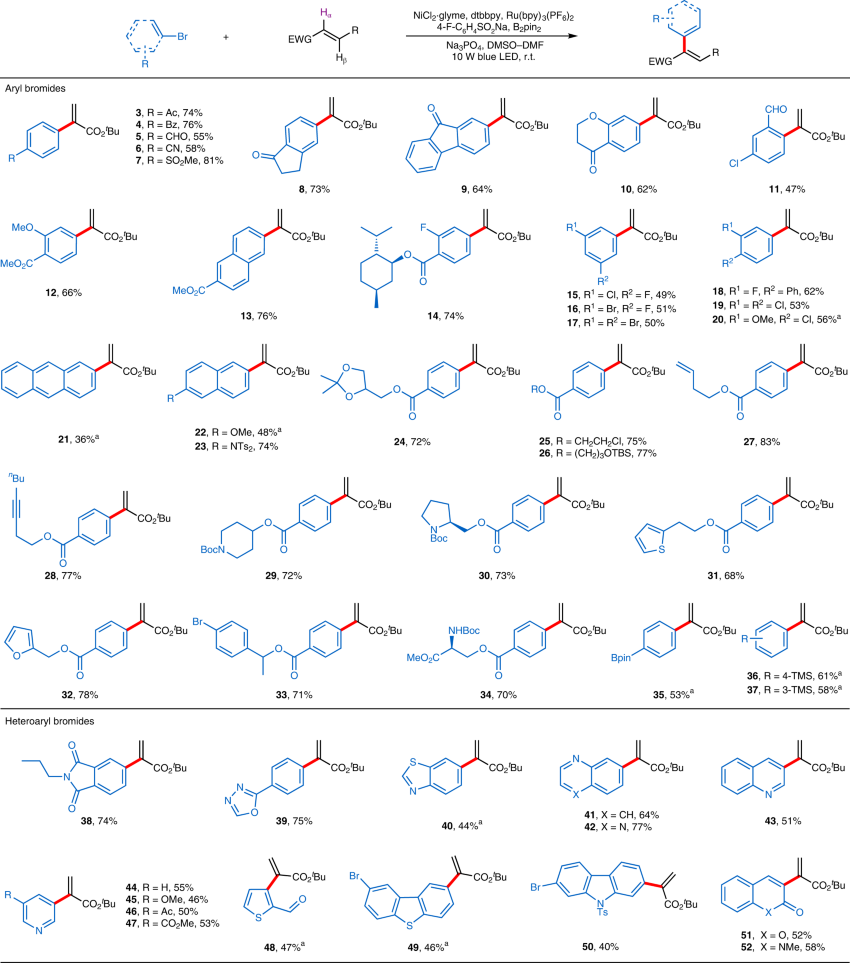 1. Reactions were conducted on a scale of 0.15 mmol. The yields correspond to the isolated material after purification. Reaction conditions: aryl bromide (0.15 mmol), alkene (0.3 mmol), NiCl2·glyme (10 mol%), dtbbpy (15 mol%), Ru(bpy)3(PF6)2 (1 mol%), 4-F-C6H4SO2Na (30 mol%), B2pin2 (0.85 equiv.), Na3PO4 (1.1 equiv.) and DMSO–DMF (0.9:0.6 ml) under irradiation with a 10 W blue LED for 24 h. See the Supplementary Information for details. aThe reaction was performed for 30 h. r.t., room temperature; Bz, benzoyl; Boc, tert-butoxycarbonyl; TMS, trimethylsilyl.