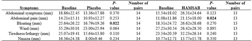 1. Data are shown as mean ± s.d. Symptoms were measured out of 100 mm. No significant differences in baseline responses were found between the two arms. n = 20 per group. In bold: P < 0.05. Two-tailed paired t-test.