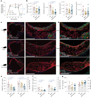 a, Plasma total and HDL cholesterol concentrations were measured in serial blood samples during the study. Plasma triglyceride concentrations were measured at the endpoint. Data are presented as mean ± SEM for n = 8 HF and n = 9 12wLF/ASO mice. P values were calculated with repeated-measures ANOVA for the intervention period with Tukey’s post-test (Total and HDL cholesterol) or two-sided unpaired t-test with Welch’s correction (Triglycerides). b, Counts of tdT-negative ACTA2+ cells in aortic root sections from the 4-week and 12-week regression experiments. Data are presented as mean ± SEM for n = 9 HF, n = 13 4wLF, and n = 13 4wLF/ASO mice from the 4-week regression experiment, and n = 7 HF and n = 8 12wLF/ASO mice from the 12-week regression experiment (missing data points due to technical issues). Differences are not statistically significant.