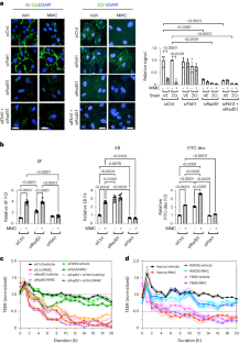 Extended Data Fig. 2 Transfer of VE-Cad and Rad51 to PMVECs damaged by MMC and transcriptional activation of ATF4 target genes in MMC-treated PMVECs.