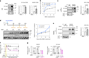 (a) The levels of intracellular VE-Cad, Rad51, and β-actin (loading control) protein in the MMC-treated PMVECs (recipient cells; 1 × 106 cells) after the incubation with the CM from PMVECs (1 × 106 cells) treated with vehicle (CMveh) or MMC (CMMMC) for 14 h were examined by immunoblot analysis. (b) IF staining of PMVECs treated with CMveh or CMMMC (5 × 103 cells) with an anti-VE-Cad antibody (green). Cell nuclei were stained with DAPI (blue). Scale bar=10 mm. (c) CM was collected from PMVECs following two h of MMC treatment and was immediately reintroduced to the donor cells’ CM after MMC was removed from the CMMMC (-MMC, indicated in red), or it was added without removing MMC ( + MMC, indicated in blue). Duplicate samples were used. Non-specific IgG (IgG) was used as a negative control for IP. Subsequently, following a 14 h incubation period, the VRC amount in the donor cells was evaluated. (d) RNA-seq data (MMC 0 h vs 4 h) is plotted on a volcano map. X-axis and Y-axis indicate p-value (-Log10) and fold change (FC) (Log2). Annotated red dots indicate known ATF4 targets. n = 3 independent RNA samples per condition. Data are analyzed by one-way ANOVA with Tukey’s post-hoc test (c).