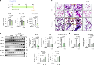(a) RVSP and RV/LV + S ratio in WT rats was measured eight days after the administration of vehicle or MMC and shown as mean ± SEM. n = 6 independent samples. (b) To examine the morphology of the pulmonary arteries (PAs) and veins (PVs), lungs were harvested from WT rats eight days after administering vehicle or MMC and subjected to H&E staining. An asterisk indicates the location of the vessels. Scale bar=10 mm. (c) WT rats administered with vehicle or MMC with or without 16-day (16d) or 8-day (8d) treatment with ISRIB were harvested on day 24, and the lung weight/body weight ratio was examined. n = 5–11 per condition. (d) The lung lysates of vehicle- or MMC-treated WT rats with or without 16-day or 8-day treatment with ISRIB were subjected to immunoblot of indicated proteins. β-actin is loading control. Quantitation of these blots is shown in Fig. 8e. n = 2–3 per condition. Data are analyzed by two-sided unpaired student’s t-test (a); one-way ANOVA with Tukey’s post-hoc test (c).