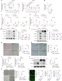 a and b, HUVECs were treated with Ad-NC or Ad-KLF4 for 24 h, and the expression of KLF4, NOS3 and IGFBP6 was determined by qRT-PCR (a, n = 5), and ELISA (b, n = 3). c, HUVECs were transfected with si-NC or si-MVP for 48 h and then treated with TNF-α for 6 h. The expression of MVP, ICAM-1and SELE was determined by qRT-PCR (n = 3). d, HUVECs were treated as indicated and THP-1 monocyte adhesion assay was performed and the number of adherent monocytes were quantified (n = 3). Scale bar: 50 μm. Statistical analysis was performed by two-tailed paired t test for a, by Student’s t test for b, by two-way ANOVA (repeated measures) followed by the Bonferroni’s test for c, and by two-way ANOVA followed by the Tukey’s test for d.