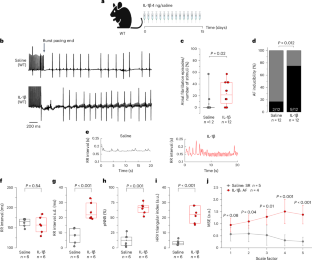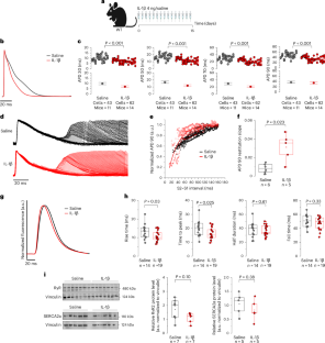 a, graphical scheme of experiments. IL-1r-/- mice were treated for 15 days with saline or IL-1β subcutaneously (SC). b, representative EKG traces from saline and IL-1β treated mice. c, EKG parameters analyzed: RR interval, p wave duration, and PR interval. d, representative action potential traces from saline and IL-1β treated mice. e, action potential duration (APD) at 30%, 50%, 70% and 90% of repolarization, from saline and IL-1β treated mice. Lower inset panel show adjusted mean ± 95% C.I.All the central lines in the box plots represent the median, the box limits represent the first and third quartiles and the whiskers denote the minimum and maximum values. Categorical data are presented as bar plots (f). P values were calculated with unpaired Student’s t-test (two-tailed) (c), hierarchical analysis with mixed effect model (e), and Fisher’s exact test (two-tailed) (f).